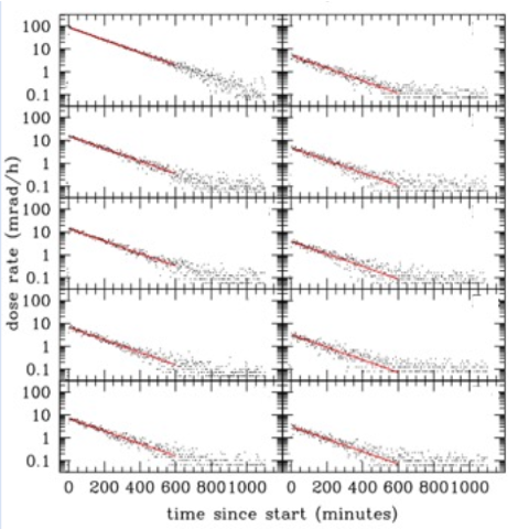 Plot shows 5,500 independent two-minute measurements of a decaying Tc-99m (140 keV) source over more than 20 hours (2.3 half-lives). Nine (9) different camera units were tested at once (differences in distance account for slight vertical offsets). The red- line shows the expected decay curve. Note the consistency of measurement across 9 sensors with hundreds of measurements each.